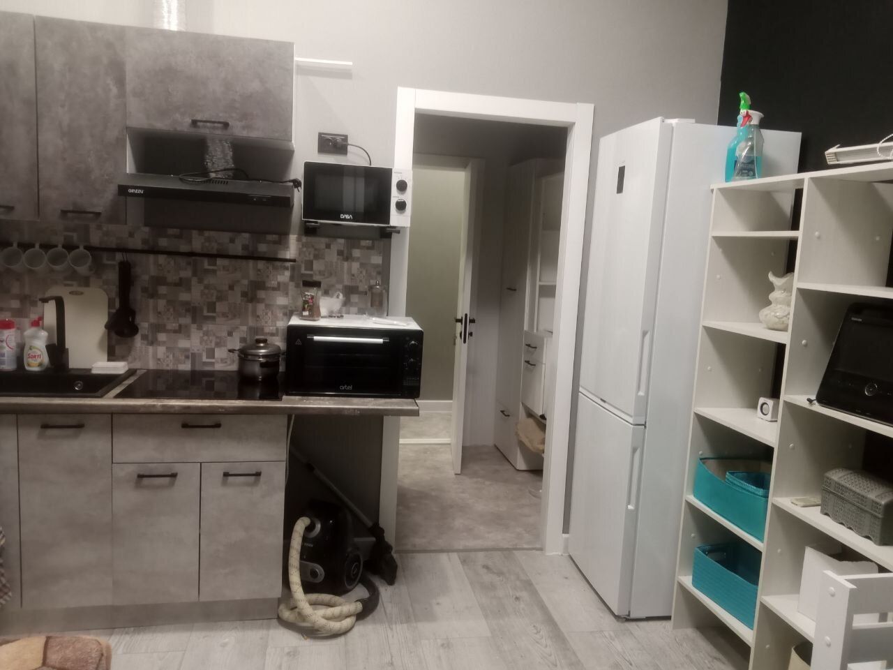 -полностью оборудованная кухня со всеми принадлежностями и техникой.