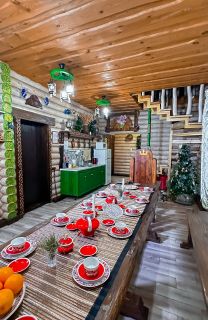на первом этаже просторная ТРАПЕЗНАЯ с красивой деревянной мебелью выполненной под древнерусскую старину — двери, большой трехметровый стол, лавки и стулья. Все выдержано в одном стиле! КУХНЯ со всей необходимой посудой и бытовой техникой: холодильником, СВЧ печью, чайником, плитой. Также имеется: большая плазма, спутниковое ТV, музыкальная аппаратура, КОНДИЦИОНЕР, бесплатный Wi-Fi и конечно же КАРАОКЕ . БАННАЯ ЧАСТЬ терема представлена русской парной на дровах с вениками и большим спа-бассейном с подогревом , аэрогидромассажем и современной системой фильтрации. Отопление централизованное, полы с подогревом;