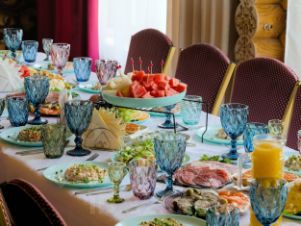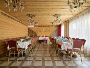 1. Собственная кухня с банкетным и фуршетным меню. Также готовим завтраки, обеды и ужины для проживающих гостей.