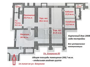 Общая площадь помещения 208,7 кв.м., планировка включает в себя 3 просторных торговых зала (48,1 + 44,9 + 25,9 кв.м.), кабинет (13,9 кв.м.), подсобное (12,9 кв.м.), техническое (16,1 кв.м.) помещение и 2 санузла. Кроме того, имеется дополнительный (запасной) выход во двор. Пожарная и охранная системы.