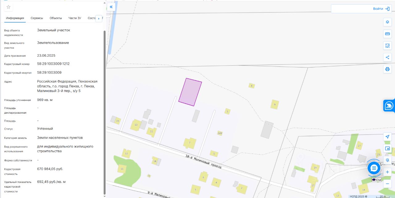 Адрес: Российская Федерация, Пензенская область, г.о. город Пенза, г. Пенза, Малиновый 3-й пер., з/у 5. Площадь: 969 кв. м. Кадастровый номер: 58:29:1003009:1212. Разрешенное использование (назначение): для индивидуального жилищного строительства.