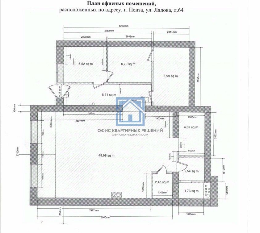 Четыре комнаты 49 кв.м.,9 кв.м.,6.7 кв.м. и 6,5 кв.м.,два санузла, кладовая, удобная зона ожидания.