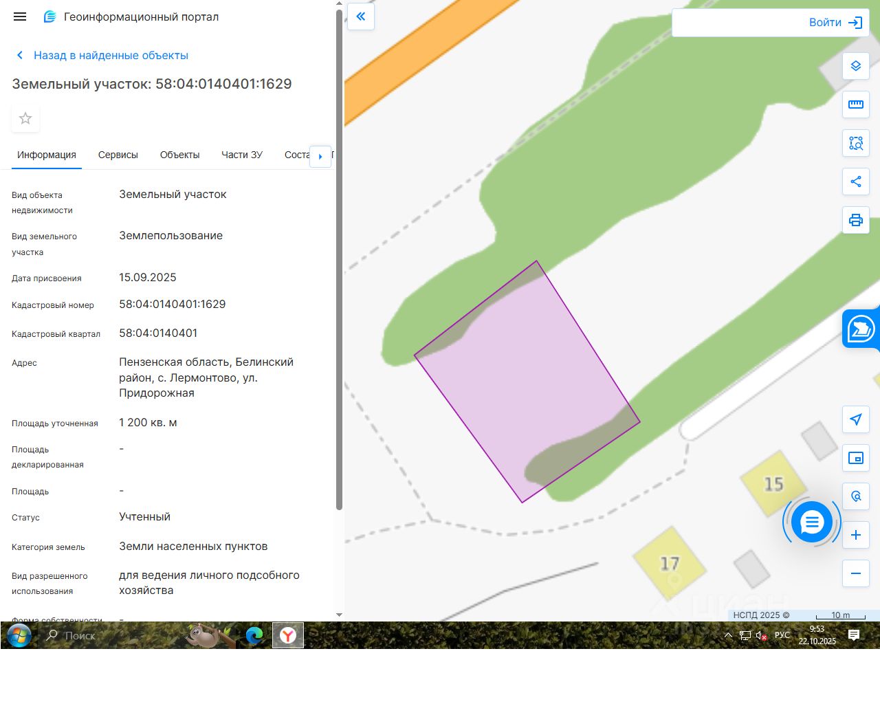 земельный участок, государственная собственность на который не разграничена, из земель населенных пунктов, с кадастровым номером 58:04:0140401:1629, площадью 1200 кв. м, расположенный по адресу: Пензенская область, Белинский район, с. Лермонтово, ул. Придорожная, разрешенное использование: для ведения личного подсобного хозяйства.