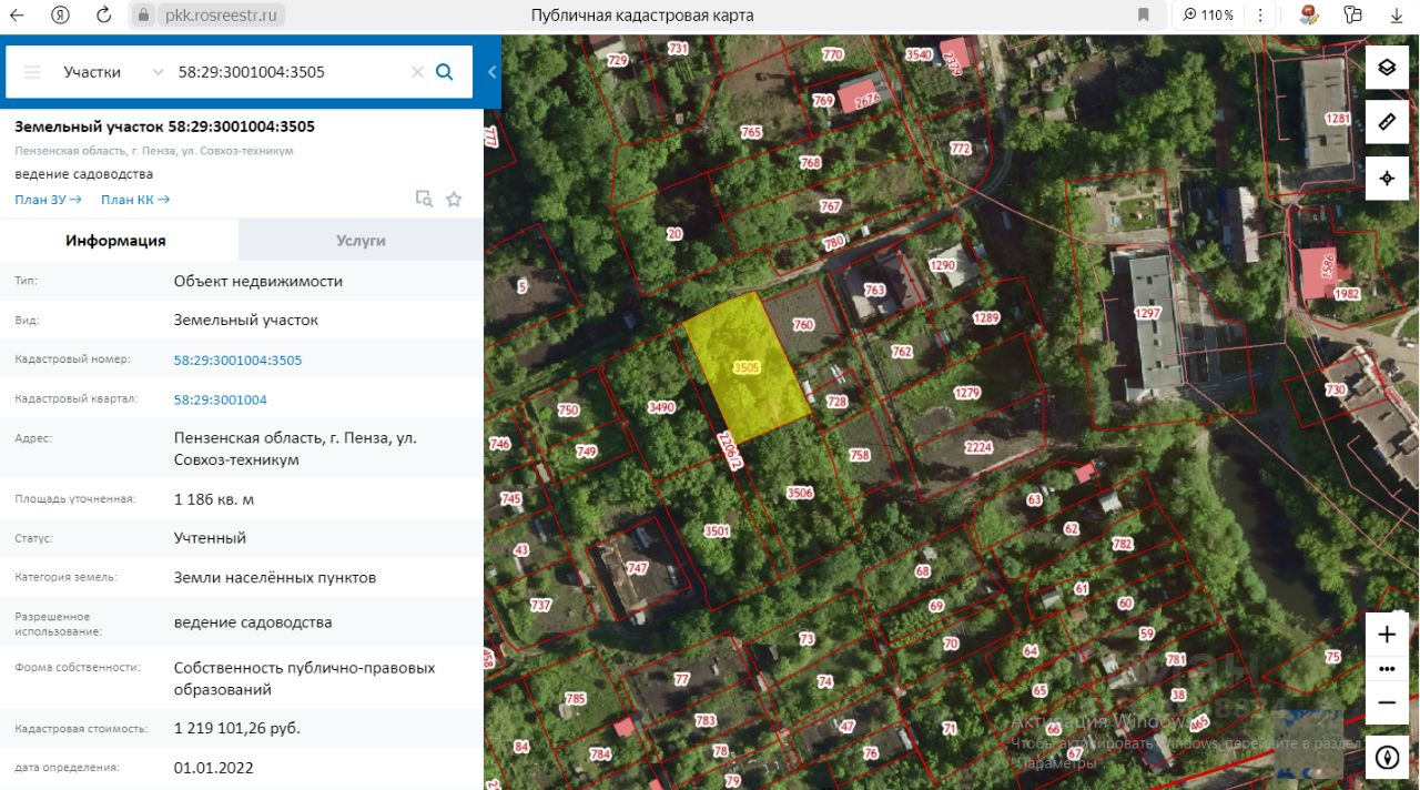 земельный участок с кадастровым номером 58:29:3001004:3505, категория земель: земли населенных пунктов, вид разрешенного использования: ведение садоводства, площадью 1 186 кв.м., адрес (местоположение): Пензенская область, г. Пенза, ул. Совхоз-техникум