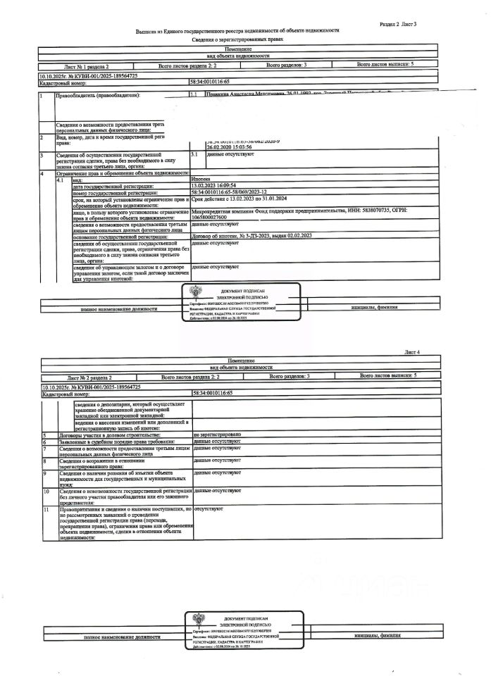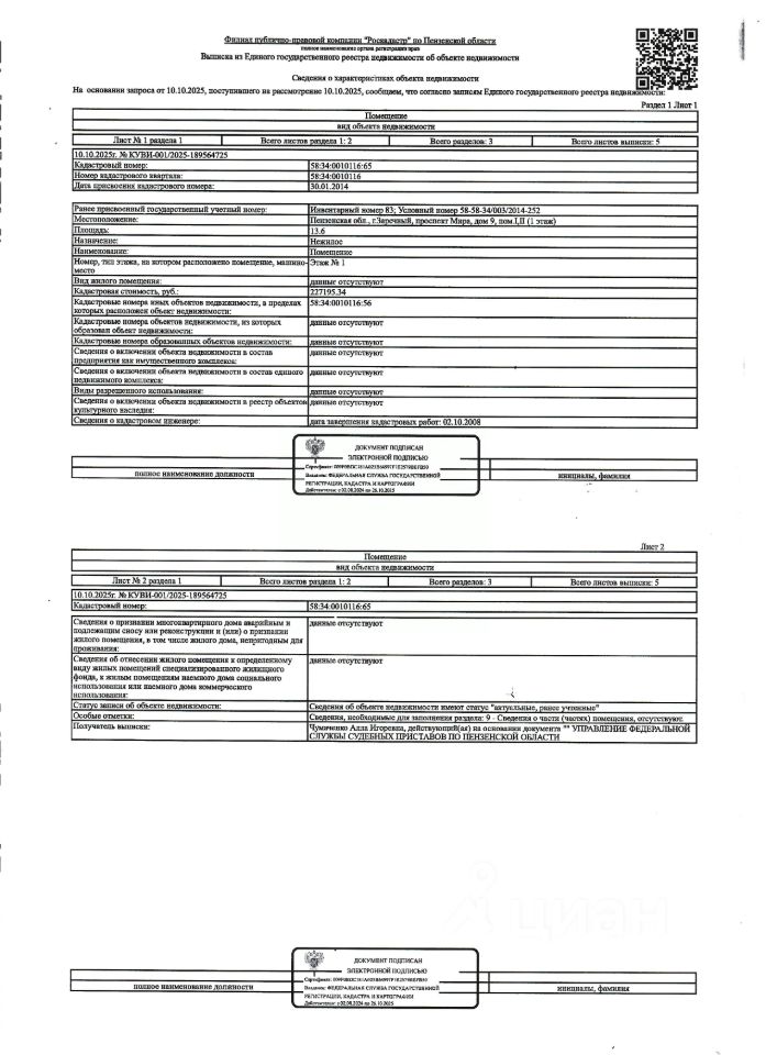 Нежилое помещение (этаж 1) общей площадью 13,6 кв.м., кад. 58:34:0010116:65, находящееся в пределах объекта недвижимости с кад. 58:34:0010116:56, принадлежащее должнику Правкиной А.М. Сведениями о задолженности по коммунальным и иным платежам, а также о фактическом состоянии объекта недвижимости организатор торгов не располагает. Ключи, техническая документация и фотографии объекта отсутствуют у организатора торгов.