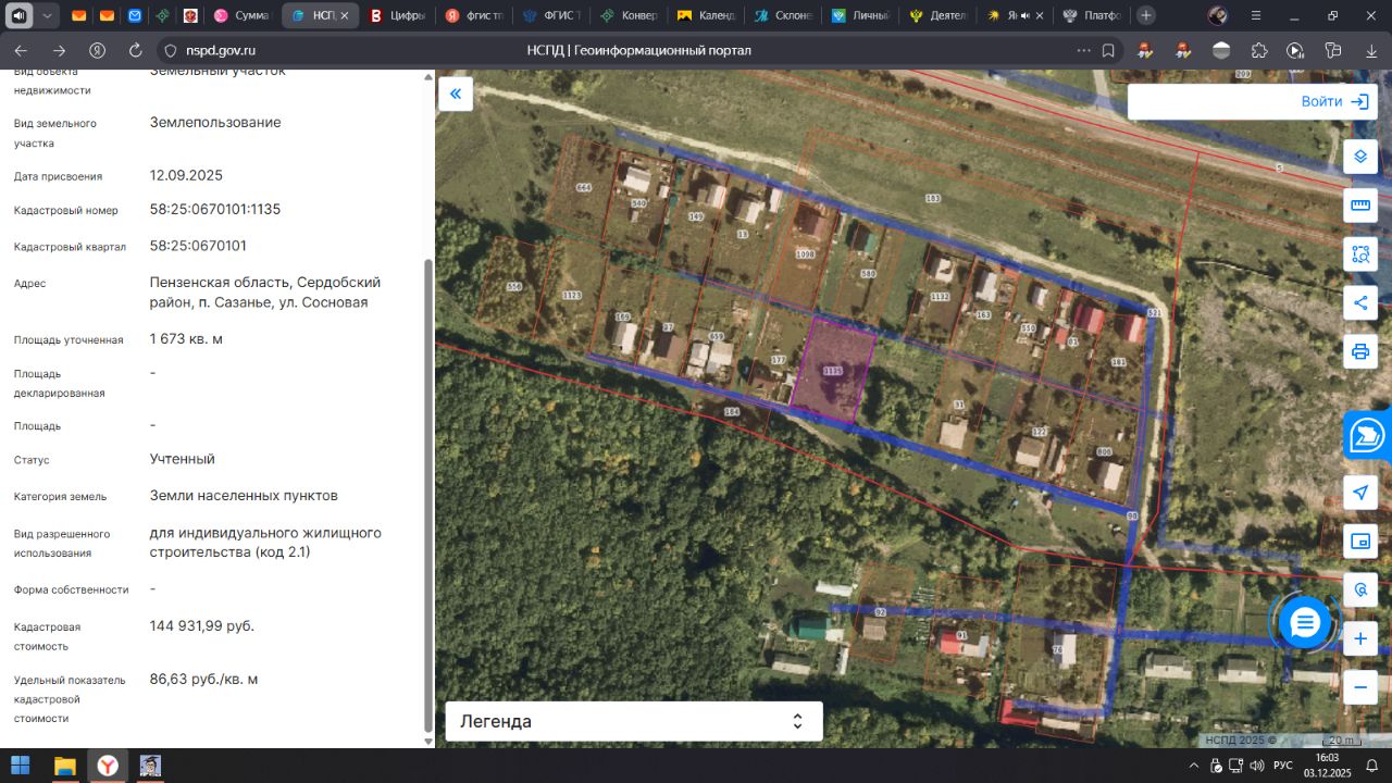 Земельный участок из категории земель - земли населенных пунктов, разрешенное использование для индивидуального жилищного строительства (код 2.1), с кадастровым номером 58:25:0670101:1135, общей площадью 1673 кв.м, адрес (местоположение) объекта: Пензенская область, Сердобский район, п. Сазанье, ул. Сосновая. Цель использования - для индивидуального жилищного строительства.