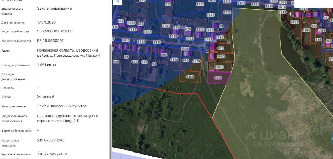 Земельный участок из категории земель - земли населенных пунктов, разрешенное использование для индивидуального жилищного строительства (код 2.1), с кадастровым номером 58:25:0630201:4373, общей площадью 1651 кв.м, адрес (местоположение) объекта: Пензенская область, Сердобский район, с. Пригородное, ул. Пески-1. Цель использования - для индивидуального жилищного строительства.