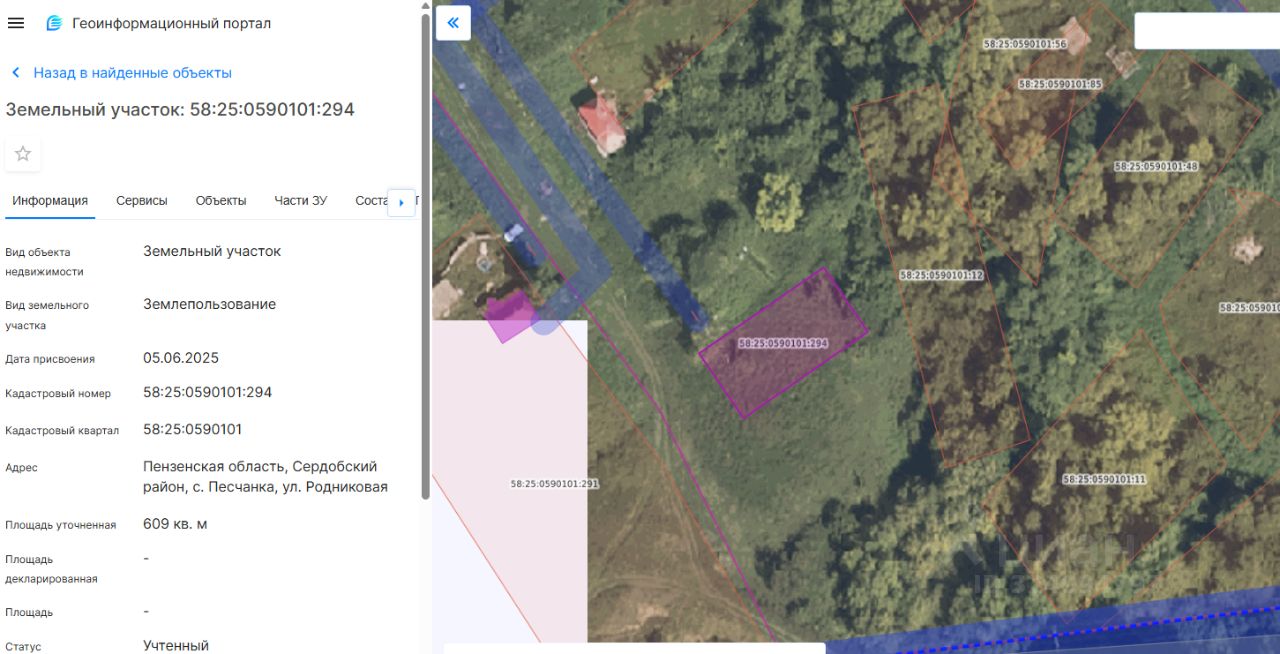 Земельный участок из категории земель - земли населенных пунктов, разрешенное использование для индивидуального жилищного строительства (код 2.1), с кадастровым номером 58:25:0590101:294, общей площадью 609 кв.м., адрес (местоположение) объекта: Пензенская область, Сердобский район, с. Песчанка, ул. Родниковая. Цель использования - для индивидуального жилищного строительства.