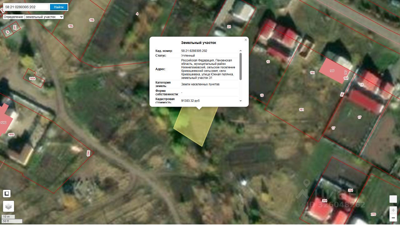 Земельный участок из земель населенных пунктов с кадастровым номером 58:21:0280305:202, разрешенное использование для индивидуального жилищного строительства (код 2.1), площадью 996 кв.м, адрес (описание местоположения): Пензенская область, Нижнеломовский район, Кривошеевский сельсовет, с. Кривошеевка, улица Южная полянка, земельный участок 31.