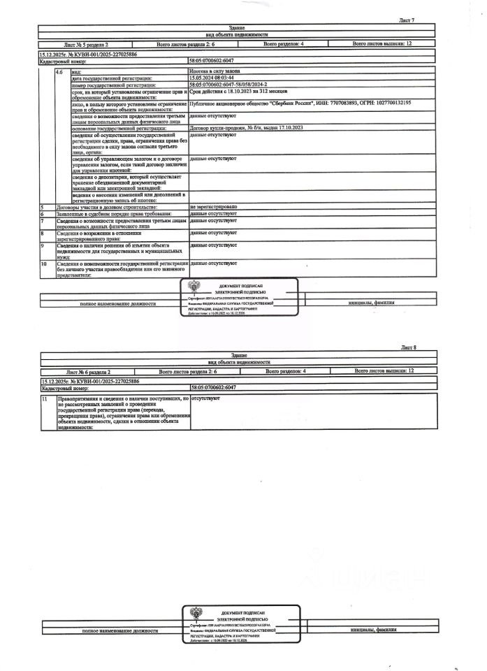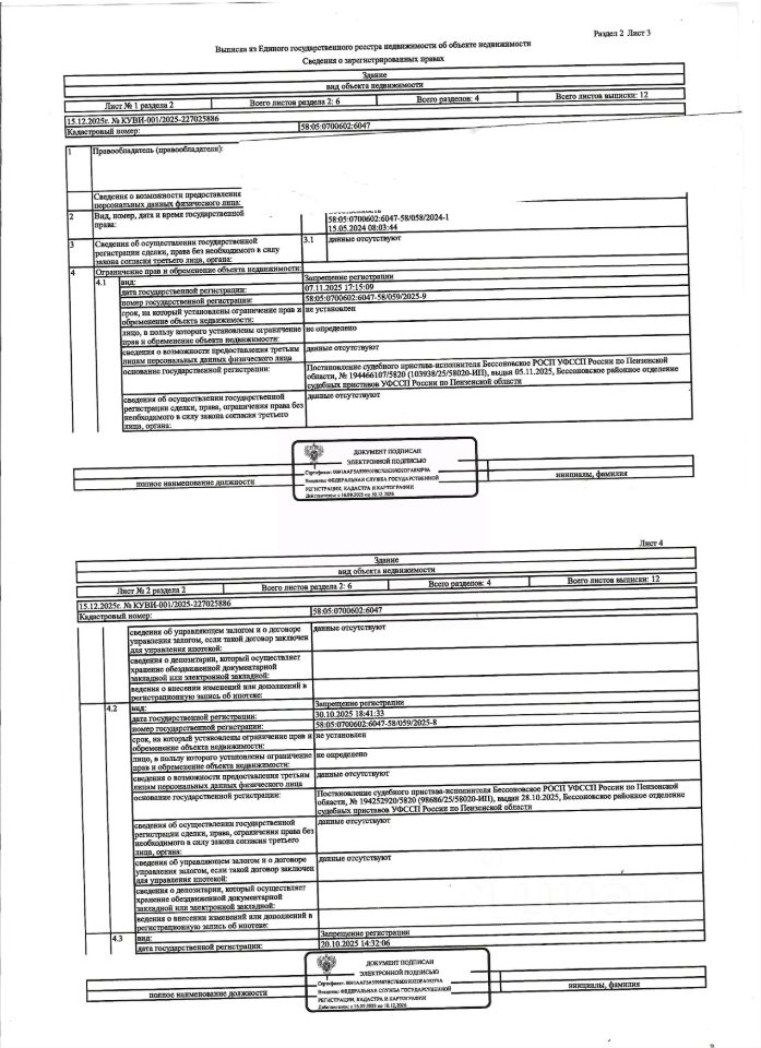Жилой дом общей площадью 144,6 кв.м., 2-х этажный, кад. 58:05:0700602:6047, и земельный участок площадью 1059+/-11 кв.м., кад. 58:05:0700602:5704, категория земель: земли населённых пунктов, виды разрешённого использования: для индивидуального жилищного строительства. Объекты недвижимости принадлежат должнику Волкову Д.В. Сведениями о зарегистрированных лицах, о фактическом состоянии имущества, о задолженности по коммунальным платежам организатор торгов не располагает. Техническая документация и фотографии объектов организатору торгов не передавались