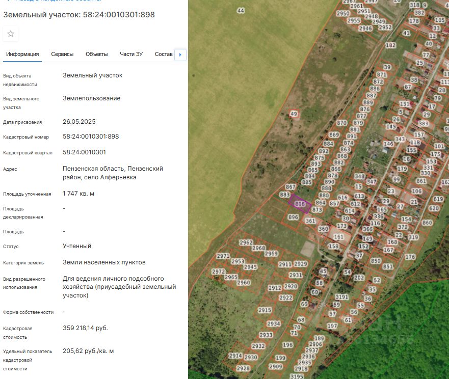 Земельный участок с кадастровым номером 58:24:0010301:898 площадь 1747 по адресу Пензенская область, Пензенский район, село Алферьевка
