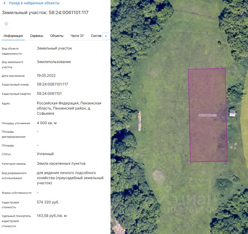Земельный участок с кадастровым номером 58:24:0061101:117 площадь 4000 по адресу Российская Федерация, Пензенская область, Пензенский район, д. Софьевка