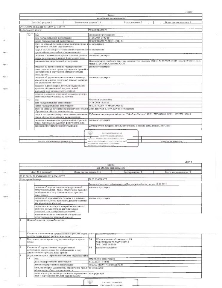 Жилой дом площадью 94,8 кв.м., кад. 58:02:0240209:77, и земельный участок площадью 1080+/-4 кв.м., кад. 58:02:0240209:16, принадлежащее на праве общей долевой собственности Паршиной Н.М, Паршиной Я.А., Паршину Н.П. Сведениями о зарегистрированных лицах, о фактическом состоянии имущества, о задолженности по коммунальным платежам и взносам на капитальный ремонт организатор торгов не располагает. Техническая документация и фотографии объектов организатору торгов не передавались.