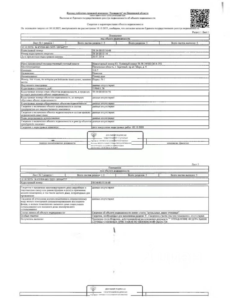 Нежилое помещение (подвал, пом. С 1 по 29) площадью 310,7 кв.м., кад. 58:34:0010116:68, находящееся в пределах объекта недвижимости с кад. 58:34:0010116:56, принадлежащее должнику Правкиной А.М. Ключи, техническая документация и фотографии объекта отсутствуют у организатора торгов. Сведения о размере задолженности по коммунальным платежам отсутствуют.