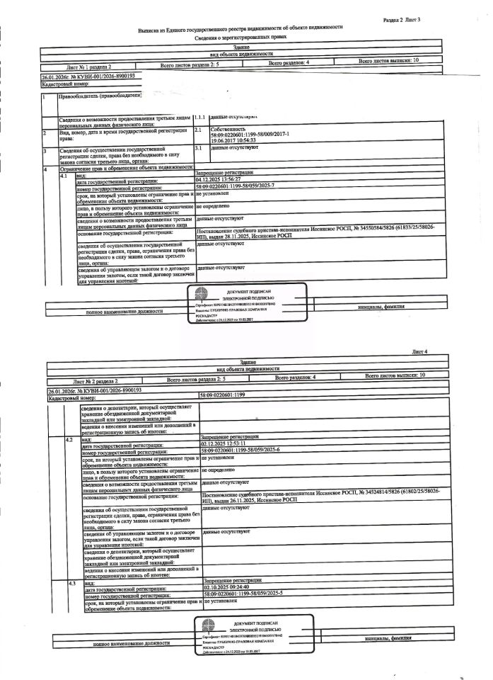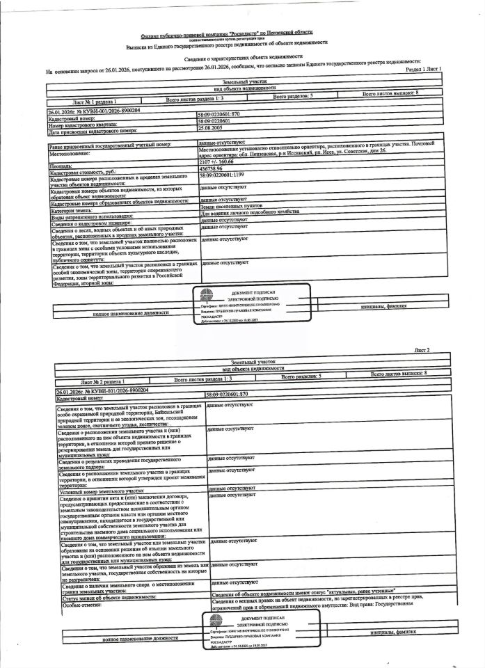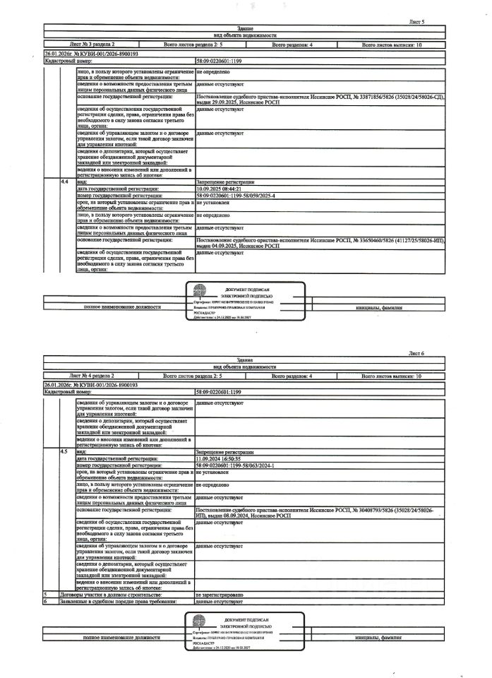 Жилой дом общей площадью 39,6 кв.м., кад. 58:09:0220601:1199, и земельный участок площадью 2107+/-160,66 кв.м., кад. 58:09:0220601:870, категория земель: земли населённых пунктов, виды разрешённого использования: для ведения личного подсобного хозяйства. Объекты недвижимости принадлежат должнику Артоболевскому Е.А. По месту нахождения объектов недвижимости зарегистрирован один гражданин. Сведениями о фактическом состоянии объектов недвижимости, организатор торгов не располагает. Ключи, техническая документация и фотографии объектов отсутствуют у организатора торгов