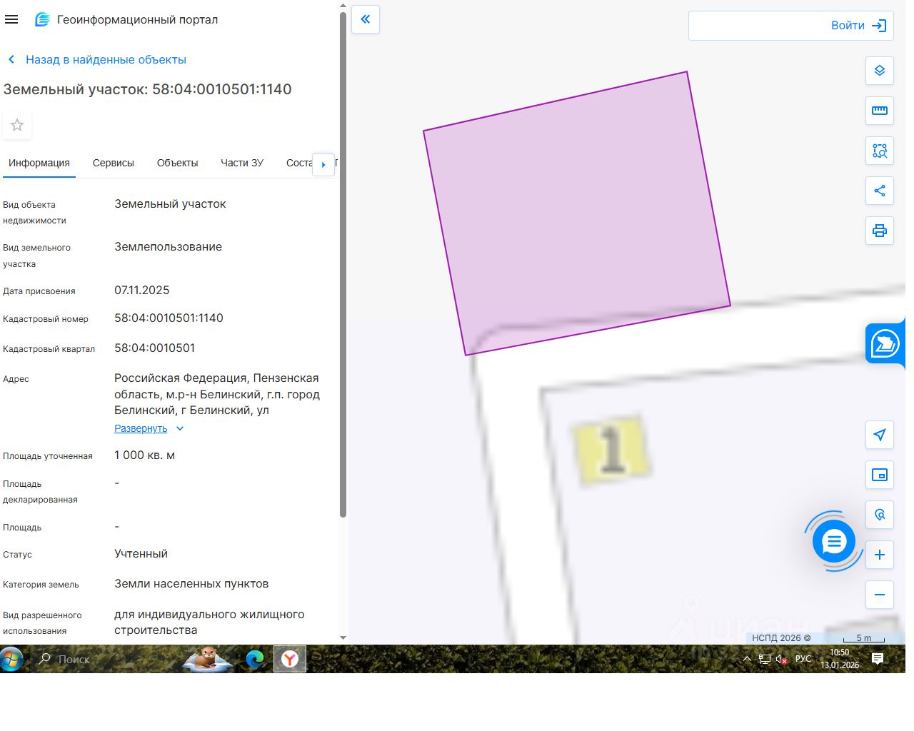 Земельный участок, государственная собственность на который не разграничена, из земель населенных пунктов, в границах территориальной зоны Ж1 "Зона индивидуальной жилой застройки постоянного проживания" с кадастровым номером 58:04:0010501:1140, площадью 1000 кв. м, расположенного по адресу: Российская Федерация, Пензенская область, м.р-н Белинский, г.п. город Белинский, г. Белинский, ул. Чембарская, вид разрешенного использования: для индивидуального жилищного строительства.