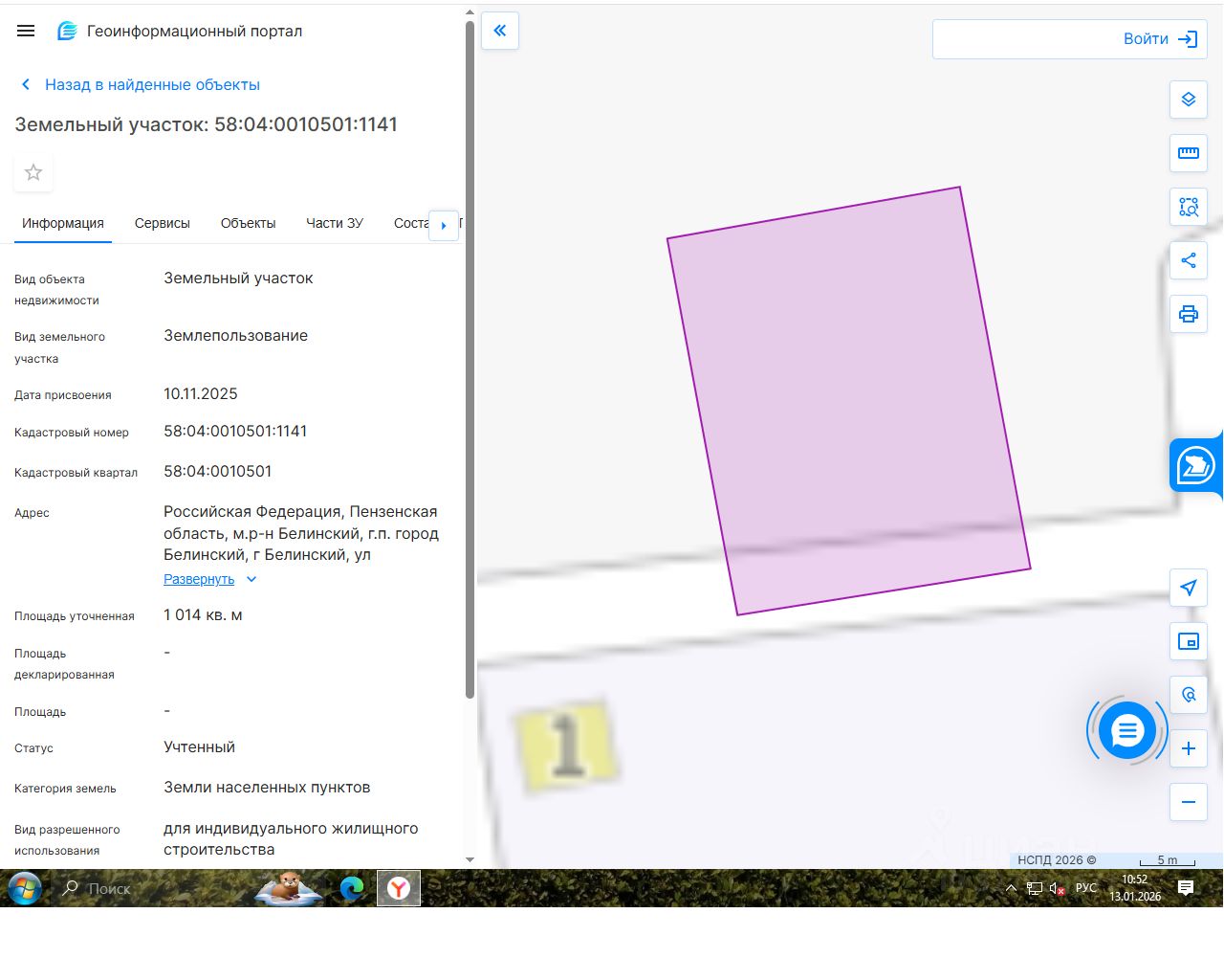 Земельный участок, государственная собственность на который не разграничена, из земель населенных пунктов, в границах территориальной зоны Ж1 "Зона индивидуальной жилой застройки постоянного проживания" с кадастровым номером 58:04:0010501:1141, площадью 1014 кв. м, расположенного по адресу: Российская Федерация, Пензенская область, м.р-н Белинский, г.п. город Белинский, г. Белинский, ул. Солнечная, вид разрешенного использования: для индивидуального жилищного строительства.