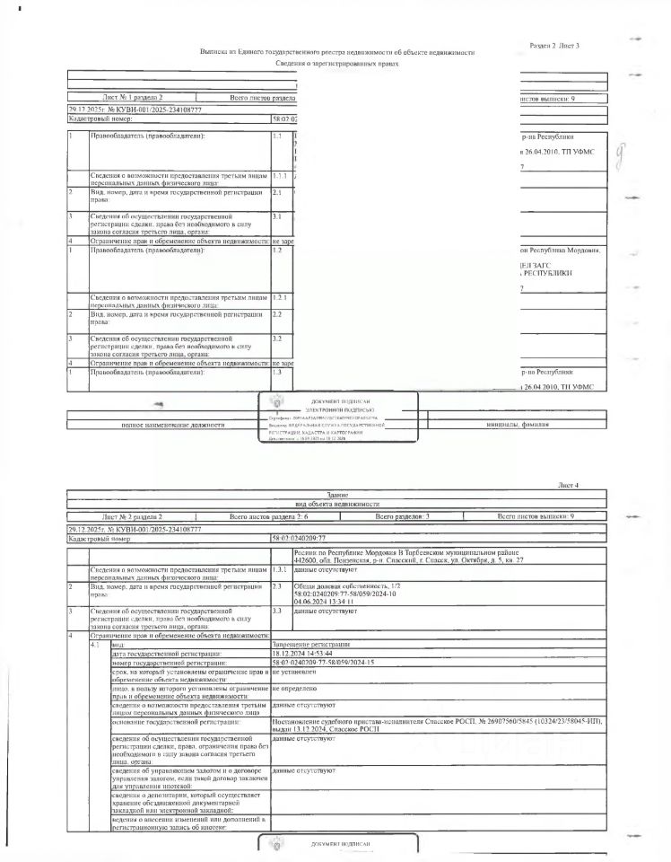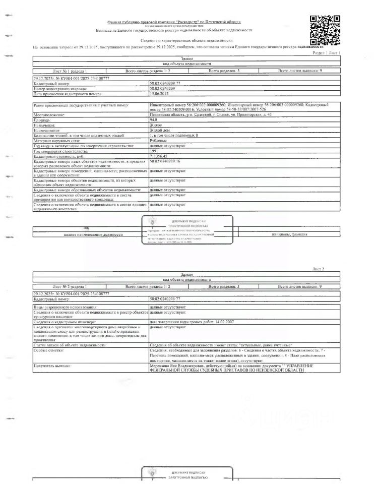 Жилой дом площадью 94,8 кв.м., кад. 58:02:0240209:77, и земельный участок площадью 1080+/-4 кв.м., кад. 58:02:0240209:16, принадлежащее на праве общей долевой собственности Паршиной Н.М, Паршиной Я.А., Паршину Н.П. Сведениями о зарегистрированных лицах, о фактическом состоянии имущества, о задолженности по коммунальным платежам и взносам на капитальный ремонт организатор торгов не располагает. Техническая документация и фотографии объектов организатору торгов не передавались.
