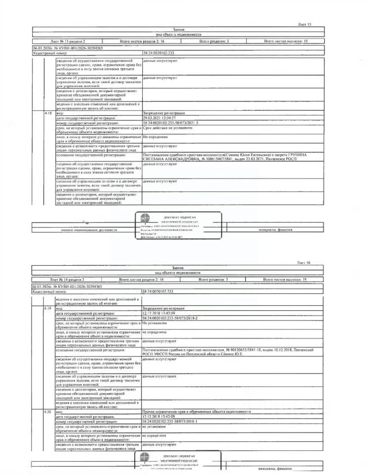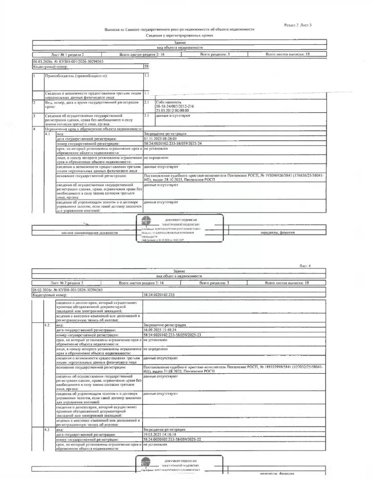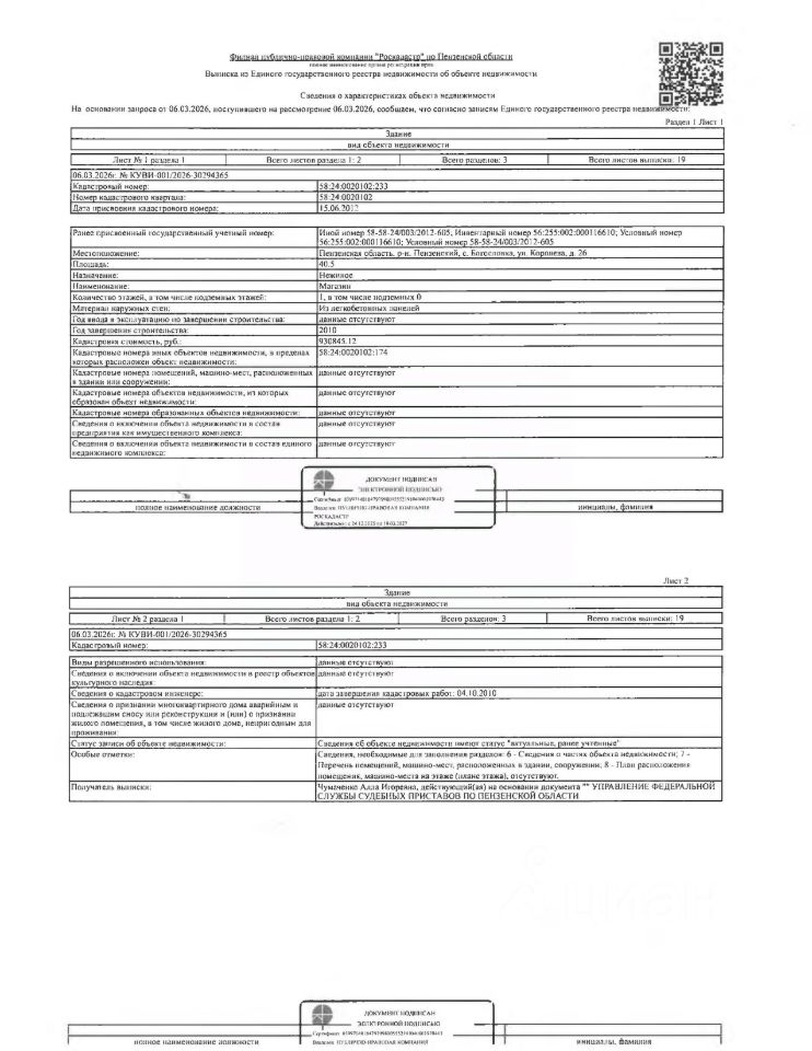 Нежилое здание (магазин) общей площадью 40,5 кв.м., кад. 58:24:0020102:233, и земельный участок площадью 150 кв.м., кад. 58:24:0020102:174, категория земель: земли населённых пунктов, виды разрешённого использования: для строительства магазина. Объекты недвижимости принадлежат должнику Груниной С.А. Сведениями о задолженности по обязательным платежам и о фактическом состоянии объектов недвижимости организатор торгов не располагает. Техническая документация и фотографии объекта отсутствуют у организатора торгов.