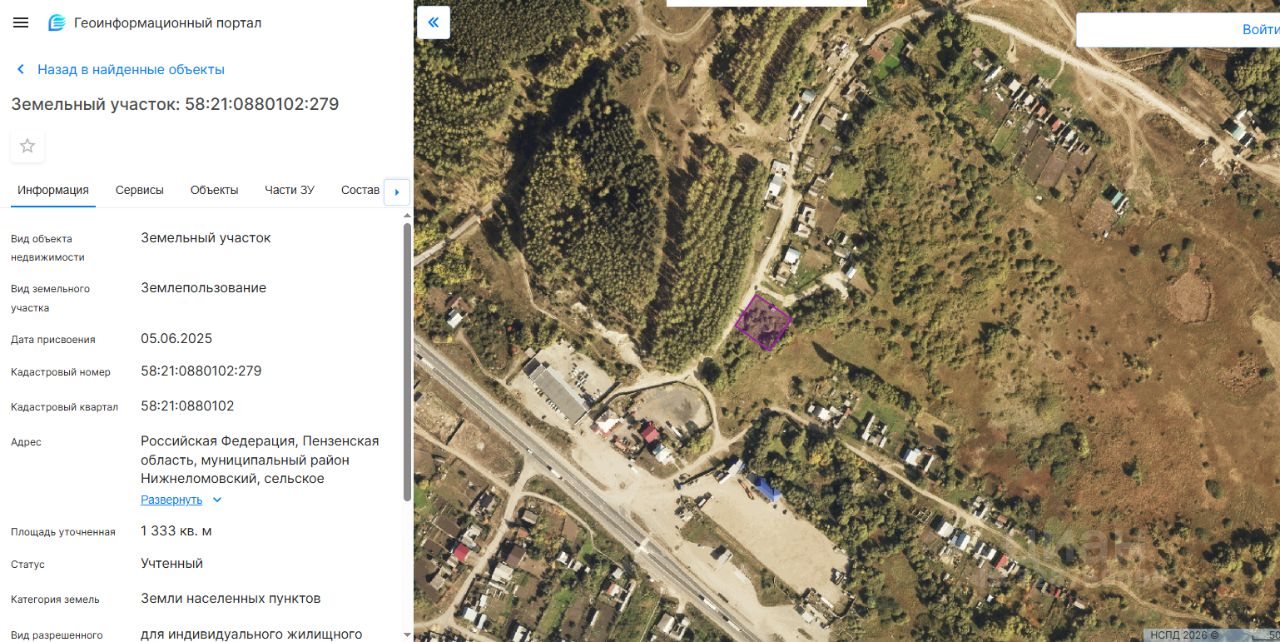 Земельный участок из земель населенных пунктов с кадастровым номером 58:21:0880102:279, разрешенное использование для индивидуального жилищного строительства (код 2.1), площадью 1333 кв.м, адрес (описание местоположения): Пензенская область, Нижнеломовский район, Большехуторский сельсовет, с. Пешая Слобода, улица Бессолаевка, земельный участок 1г.