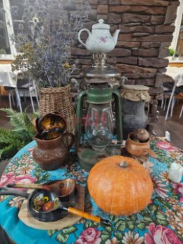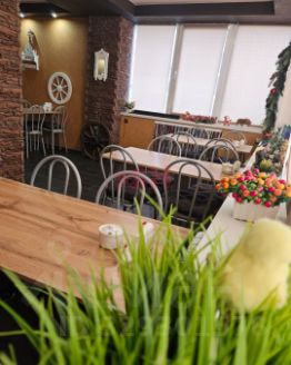 Уютное заведeниe с самобытным интерьером в старорусском стиле. Уникальный тематический дизайн, мебель и предметы интерьера, аутентичные экспонаты деревенской утвари и декора.