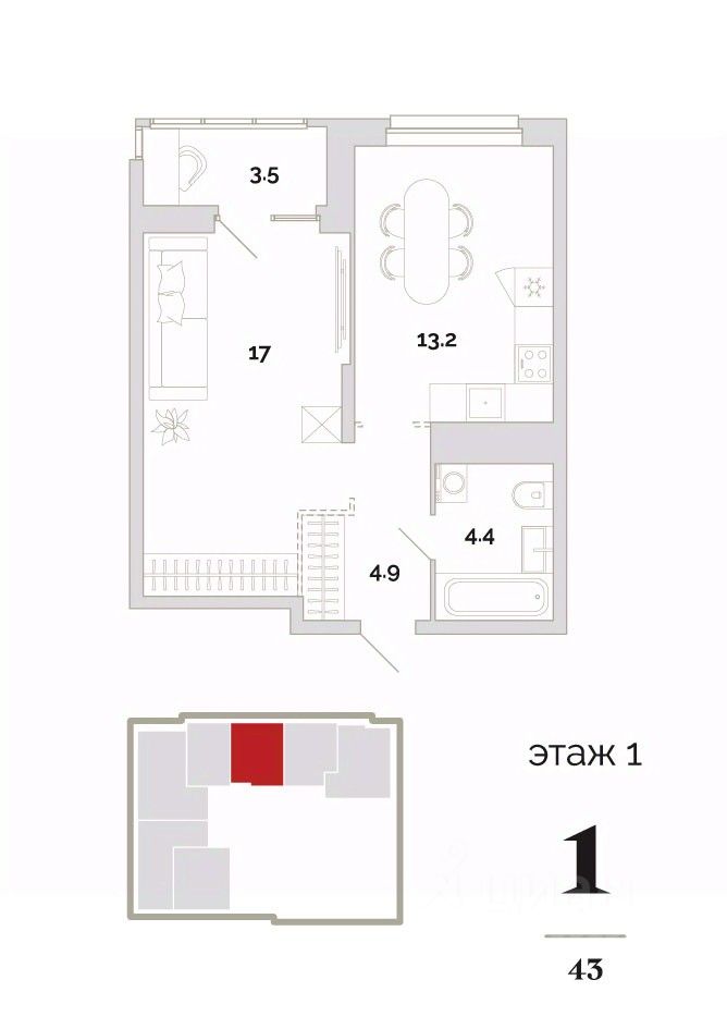 Общая площадь43 м²