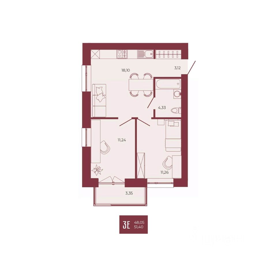 Общая площадь51,4 м²