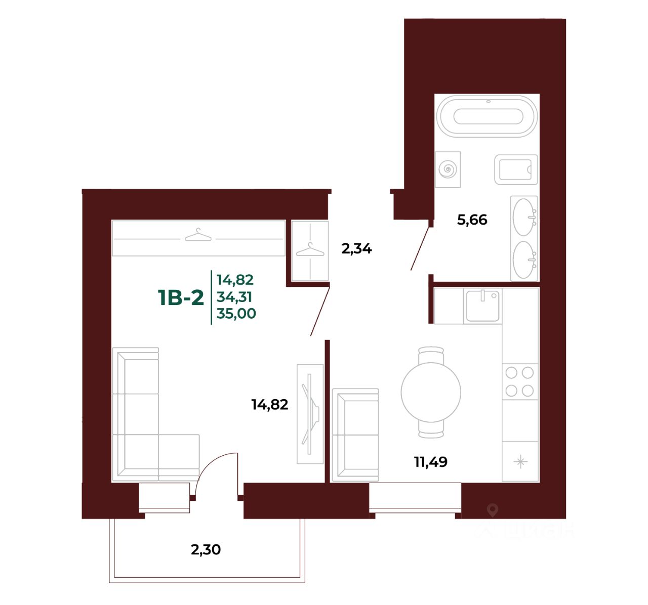 Общая площадь35,06 м²