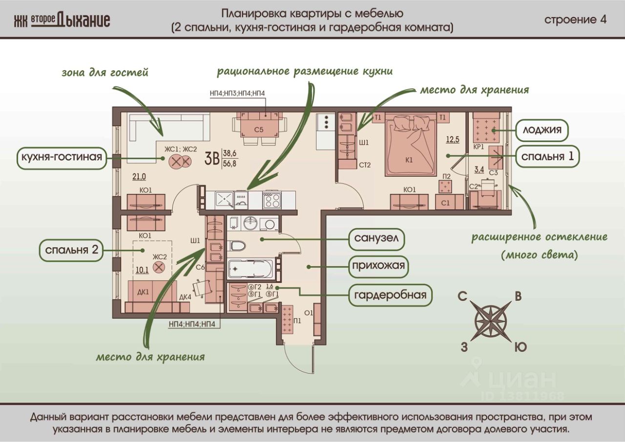 Евротрехкомнатная Квартира - "распашонка" 56,8м2. Современная планировка евро-формата, которая позволит воплотить Ваши мечты и сделать квартиру уникальной! Сердцем данной квартиры является просторная кухня гостиная 21 кв.м. и располагает к тому, чтобы вся семья собиралась по вечерам в одном месте. Изолированными остаются только спальни. Это отличное решение для семей с детьми. Если разместить игровую зону в гостиной, можно следить за ребенком, не выходя за пределы кухни. А если дети уже взрослые, большим плюсом является удалённость родительской комнаты от детской. Отдельная гардеробная комната расположенная при входе это рациональный способ решить вопрос компактного размещения вещей. Она обеспечивает сохранность предметов одежды и обуви, когда они долгое время не востребованы, а также позволяет содержать в идеальном порядке вещи, которые используются ежедневно. Окна у данной квартиры выходят на противоположные стороны дома: на дворик и улицу. Наблюдение за восходом солнца придаст дополнительные силы, а вечерний закат успокоит и поможет скоротать вечер. У квартиры данной планировки комнаты будут в течение дня равномерно освещены и хорошо проветрены. кв 310
