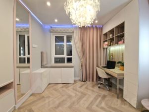 и еще много мелочей, которые все сразу не описать (розетки под гирлянды в каждой комнате, выведенные розетки под телевизоры для их установке (при необходимости), разноцветная подсветка, управляемая с пульта в комнате девочки, там же рисунок художника на стене, мощный Wifi маршрутизатор, расположенный по центру квартиры, с поддержкой 2,4 и 5 G, магнитные треки, которые можно менять местами и настраивать, зона макияжа в спальне с подсветкой