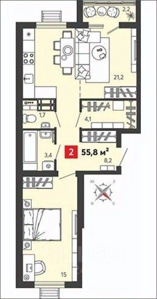 Продается 2-комн. квартира с европланировкой от застройщика в ЖК "Радужные дворы" на 4 этаже. Квартира без отделки, новый собственник может сделать ремонт по своему дизайн-проекту. Общая площадь: 55.8 кв.м., жилая: 32.1 кв.м., общая площадь гостиной-столовой с кухонной зоной: 27.1 кв.м. Европланировка, зона гостиной комнаты объединена с кухней. Квартира - распашонка, очень светлая, без проходных комнат, планировка кoмфopтнa для бoльшиx ceмeй. В квартире один балкон, один раздельный санузел. Высота потолков 2.7 м.