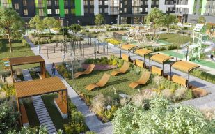 Во дворах — детские игровые комплексы, спортивные площадки, зоны с тренажерами, беседки, перголы и зоны для барбекю. На первых этажах — колясочные комнаты.