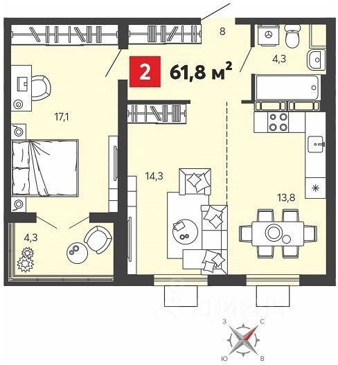 2-комн. квартира с европланировкой в ЖК "Радужные дворы" на 2 этаже. Квартира без отделки, полностью готова к ремонту. Общая площадь: 61.8 кв.м., жилая: 31.4 кв.м., общая площадь гостиной-столовой с кухонной зоной: 28.1 кв.м. Европейская планировка, кухня-гостиная - идеальный вариант для тех, кто любит часто принимать гостей. Комнаты изолированные, все окна выходят на одну сторону. В квартире одна лоджия, один совмещенный санузел. Высота потолков 2.68 м.