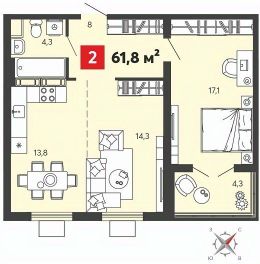 Продается двухкомнатная квартира с европланировкой от застройщика в ЖК "Радужные дворы" на 2 этаже. Квартира без отделки, после оформления собственности можно делать ремонт. Общая площадь: 61.8 кв.м., жилая: 31.4 кв.м., общая площадь гостиной-столовой с кухонной зоной: 28.1 кв.м. Европейская планировка, в просторной кухне-гостиной удобно как готовить, так и отдыхать. Комнаты изолированные, все окна выходят на одну сторону. В квартире одна лоджия, один совмещенный санузел. Высота потолков 2.68 м.