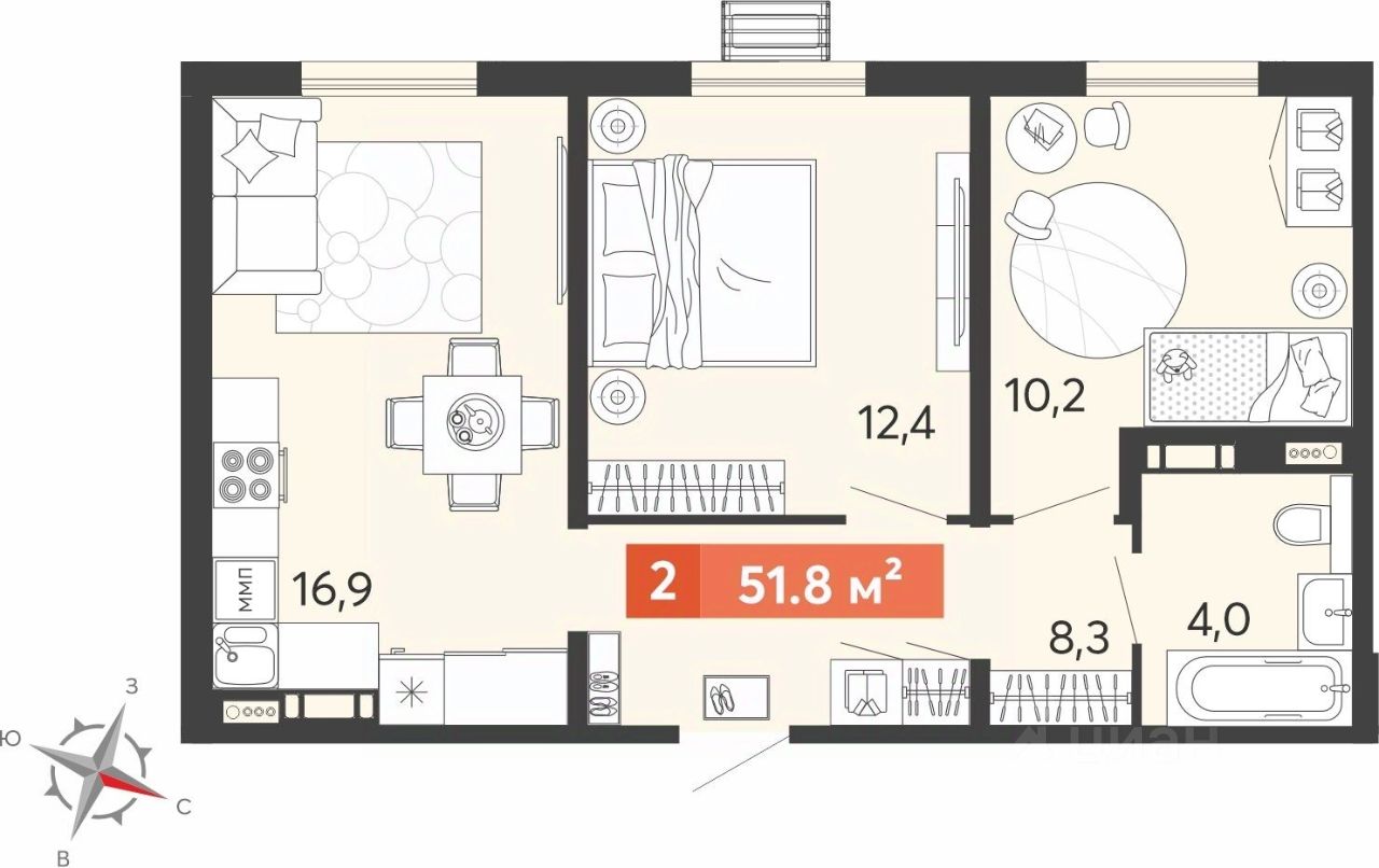 2-комн. квартира от застройщика в ЖК "Новин в Нижнем Ломове" на 5 этаже. Квартира без отделки, после выдачи ключей можно делать ремонт. Общая площадь: 51.8 кв.м., жилая: 22.6 кв.м., площадь просторной кухни-столовой: 16.9 кв.м. Комнаты изолированные, все окна выходят на одну сторону. В квартире один совмещенный санузел. Высота потолков 2.74 м.