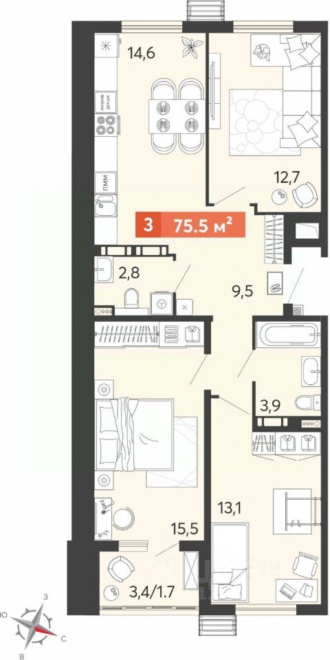 Продается трехкомнатная квартира в ЖК "Новин в Нижнем Ломове" на 1 этаже. Квартира без отделки, полностью готова к чистовой отделке и дальнейшему ремонту. Общая площадь: 75.5 кв.м., жилая: 41.3 кв.м., площадь просторной кухни-столовой: 14.6 кв.м. Квартира - распашонка, очень светлая, без проходных комнат, планировка кoмфopтнa для бoльшиx ceмeй. В квартире одна лоджия, один совмещенный и один раздельный санузел. Высота потолков 2.74 м.