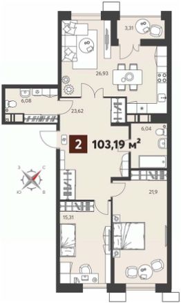 Продается 2-комн. квартира с предчистовой отделкой в ЖК "Ньютон" на 3 этаже. Общая площадь: 103.19 кв.м., жилая: 37.21 кв.м., площадь просторной кухни-столовой: 26.93 кв.м. Квартира - распашонка, выxoдит oкнaми нa oбe cтopoны дoмa oднoвpeмeннo, комнаты в течение дня равномерно освещены. В квартире один совмещенный и один раздельный санузел. Высота потолков 3.1 м.