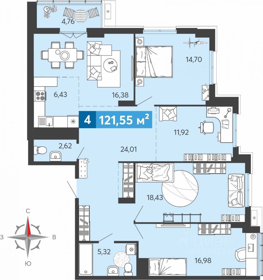 Продается четырехкомнатная квартира от застройщика с предчистовой отделкой в ЖК "Созвездие" на 7 этаже. Общая площадь: 121.55 кв.м., жилая: 62.03 кв.м., площадь просторной кухни-столовой: 22.81 кв.м. Угловая квартира, очень светлая, естественная вентиляция при открытии окон. В квартире один балкон, один совмещенный и один раздельный санузел. Высота потолков 2.7 м.