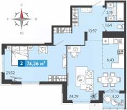 2-комн. квартира с европланировкой и предчистовой отделкой в ЖК "Созвездие" на 7 этаже. Общая площадь: 74.36 кв.м., жилая: 45.91 кв.м., общая площадь гостиной-столовой с кухонной зоной: 30.82 кв.м. Европейская планировка, кухня и гостиная объединены в одно просторное помещение. Квартира угловая, идеально подойдет любителям тишины и панорамных видов. В квартире одна лоджия, один раздельный санузел. Высота потолков 2.7 м.