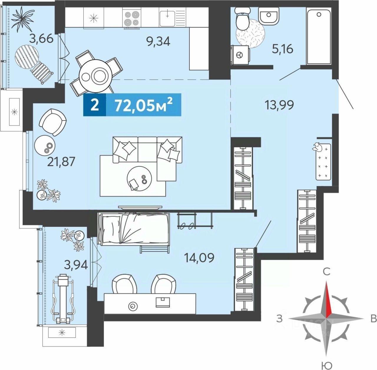 2-комн. квартира с европланировкой и предчистовой отделкой в ЖК "Созвездие" на 7 этаже. Общая площадь: 72.05 кв.м., жилая: 35.96 кв.м., суммарная площадь гостиной-столовой с кухонной зоной: 31.21 кв.м. Европейская планировка, кухня-гостиная - идеальный вариант для тех, кто любит часто принимать гостей. Комнаты изолированные, все окна выходят на одну сторону. В квартире две лоджии, один совмещенный санузел. Высота потолков 2.7 м.