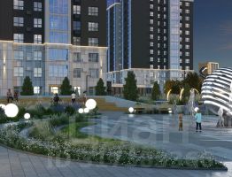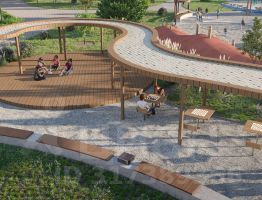 Закрытый двор без машин с уникальным космическим дизайном: сухой фонтан "Планета", амфитеатр, детские площадки, канатный комплекс, зоны для спорта и настольных игр. Озеленение хвойными и лиственными деревьями.