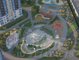 Закрытый двор без машин с уникальным космическим дизайном: сухой фонтан "Планета", амфитеатр, детские площадки, канатный комплекс, зоны для спорта и настольных игр. Озеленение хвойными и лиственными деревьями.