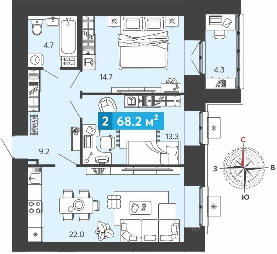 2-комн. квартира с предчистовой отделкой в ЖК "Созвездие" на 3 этаже. Общая площадь: 68.2 кв.м., жилая: 28 кв.м., площадь просторной кухни-столовой: 22 кв.м. Комнаты изолированные, все окна выходят на одну сторону. В квартире один балкон, один совмещенный санузел. Высота потолков 2.7 м.