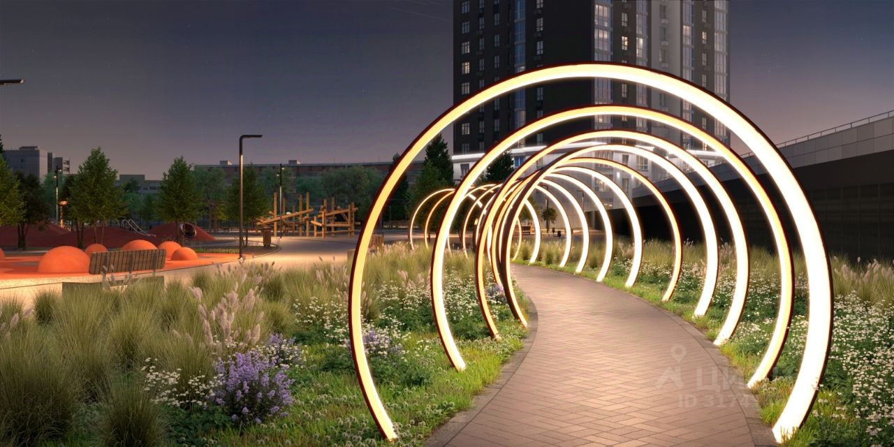 Закрытый двор без машин с уникальным космическим дизайном: сухой фонтан "Планета", амфитеатр, детские площадки, канатный комплекс, зоны для спорта и настольных игр. Озеленение хвойными и лиственными деревьями.
