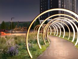 Закрытый двор без машин с уникальным космическим дизайном: сухой фонтан "Планета", амфитеатр, детские площадки, канатный комплекс, зоны для спорта и настольных игр. Озеленение хвойными и лиственными деревьями.