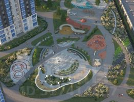 Закрытый двор без машин с уникальным космическим дизайном: сухой фонтан "Планета", амфитеатр, детские площадки, канатный комплекс, зоны для спорта и настольных игр. Озеленение хвойными и лиственными деревьями.