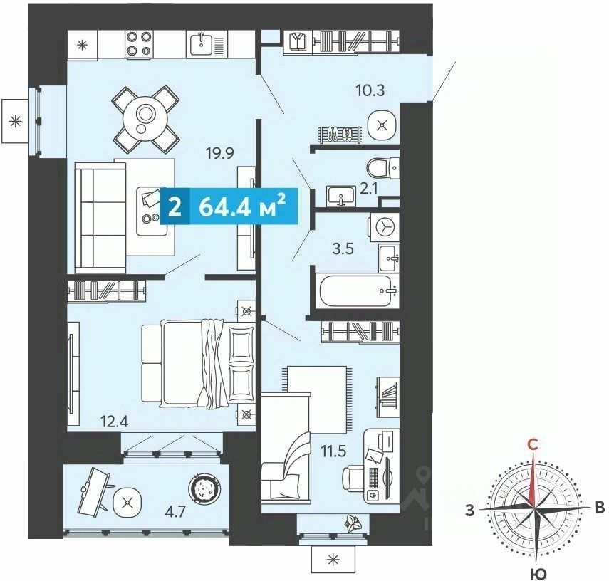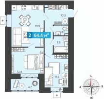 2-комн. квартира с предчистовой отделкой в ЖК "Созвездие" на 6 этаже. Общая площадь: 64.4 кв.м., жилая: 23.9 кв.м., площадь просторной кухни-столовой: 19.9 кв.м. Угловая квартира, окна oбecпeчивaют paвнoмepнoe ocвeщeниe в тeчeниe дня. В квартире одна лоджия, один раздельный санузел. Высота потолков 2.7 м.
