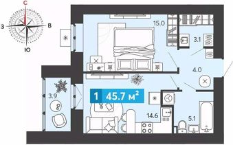Однокомнатная квартира с предчистовой отделкой в ЖК "Созвездие" на 12 этаже. Общая площадь: 45.7 кв.м., жилая: 15 кв.м., площадь просторной кухни-столовой: 14.6 кв.м. Все окна выходят на одну сторону. В квартире один балкон, один совмещенный санузел. Высота потолков 2.7 м.