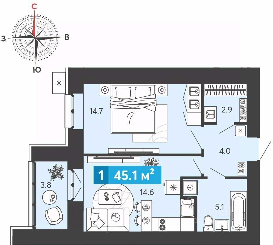1-комн. квартира с предчистовой отделкой в ЖК "Созвездие" на 2 этаже. Общая площадь: 45.1 кв.м., жилая: 14.7 кв.м., площадь просторной кухни-столовой: 14.6 кв.м. Все окна выходят на одну сторону. В квартире один балкон, один совмещенный санузел. Высота потолков 2.7 м.