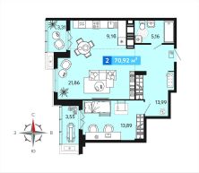 Двухкомнатная квартира с европланировкой и предчистовой отделкой в ЖК "Созвездие" на 6 этаже. Общая площадь: 70.92 кв.м., жилая: 35.75 кв.м., общая площадь гостиной-столовой с кухонной зоной: 31.02 кв.м. Европланировка, кухня и гостиная объединены в одно просторное помещение. Комнаты изолированные, все окна выходят на одну сторону. В квартире две лоджии, один совмещенный санузел. Высота потолков 2.7 м.